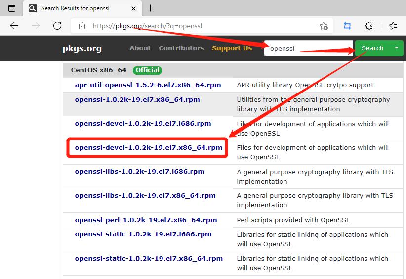 这里以安装yum install openssl-devel作为例子,首先我们要知道我们要安装的包是属于哪个源,登录这个包查询网站 https://pkgs.org/ ,搜索openssl-devel,然后找到自己对应的系统的对应包。这里注意要找x86_64