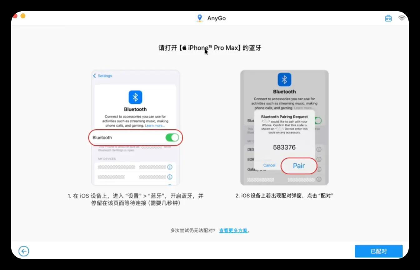 配对成功后基本就成功了一大半! 如果多次配对失败,不要着急,退出 AnyGo,拔掉数据线,重启软件甚至重启手机,多尝试几次。这个过程确实比较玄学,但多数人最终都能成功。