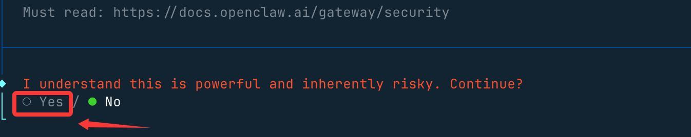 然后,会提醒你这个龙虾能力很强,当然风险也很大,我们选 yes(no 就不安装了) 就好了:
